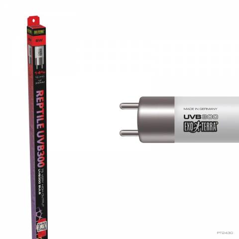 Exo Terra®’s exceptional T5 lamps are crafted in Germany to the highest quality standard, ensuring a prolonged UV output of 12+ months for lasting performance. With its intense output of UVA and UVB rays combined with a well-balanced visible light spectrum, the Reptile UVB300 T5 Very High Output Bulb is specifically designed for reptiles basking in open or midday sun in the Euphotic or Heliophotic Zones. The intensity of the emissions varies depending on the distance from the basking area.